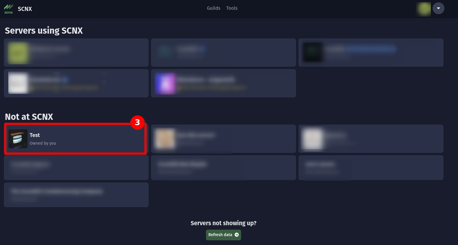 Bitte stelle sicher, dass du der Eigentümer eines Servers bist oder du Administrator-Rechte auf dem Server hast, um ihn zu SCNX hinzuzufügen. Wenn nicht, bitte den Eigentümer oder einen Administrator SCNX einzurichten und dir "Trusted Admin"-Rechte zu geben. Wenn du einen Server erst vor kurzem erstellt hast und er dir nicht angezeigt wird, aktualisiere die Serverliste mit dem "Daten neuladen" Knopf unten auf der Seite.