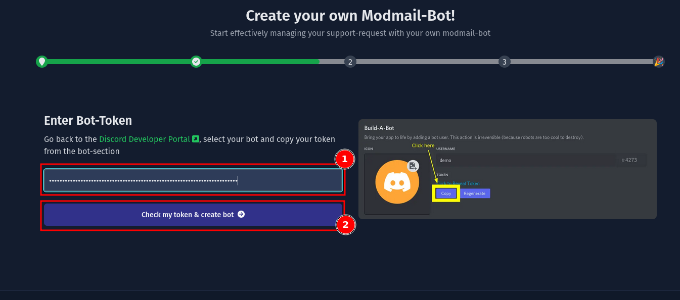 Next, you'll be asked to enter the token you obtained in step 1. Do this and click on "Check my token & create bot". SCNX will verify your token and continue to the next step if it's correct.